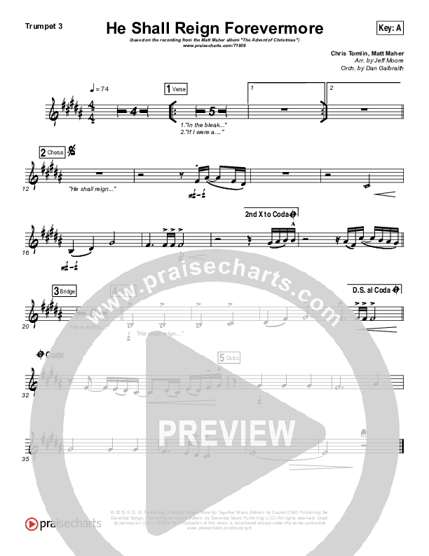 Download the Trumpet 3 sheet music for He Shall Reign Forevermore by Matt Maher, from the album The Advent Of Christmas. This song was arranged by Jeff Moore / Daniel Galbraith in the key of A, G.
