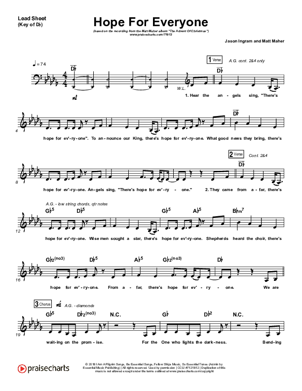 Download the sheet music for Hope For Everyone by Matt Maher, from the album The Advent Of Christmas. This song was arranged by Jeff Moore / Daniel Galbraith in the key of B, C, D, Db.