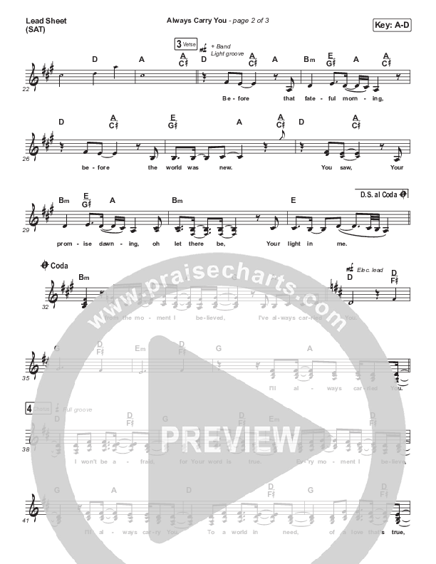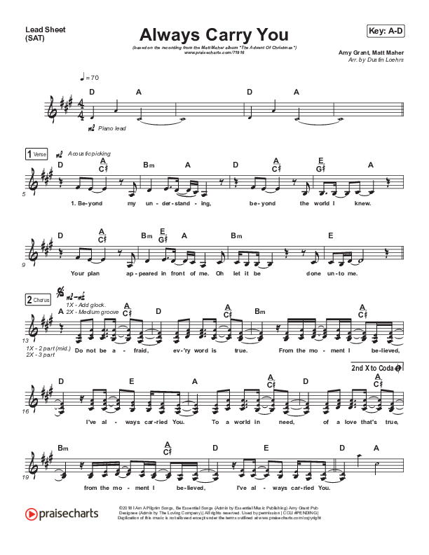 Download the sheet music for Always Carry You by Matt Maher, from the album The Advent Of Christmas. This song was arranged by Dustin Loehrs in the key of A, Bb.