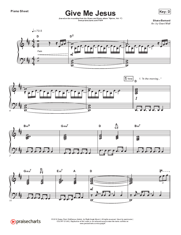 Download the piano sheet for Give Me Jesus by Shane & Shane / The Worship Initiative, from the album Hymns Vol 1. This song was arranged by Grant Wall in the key of C, D.