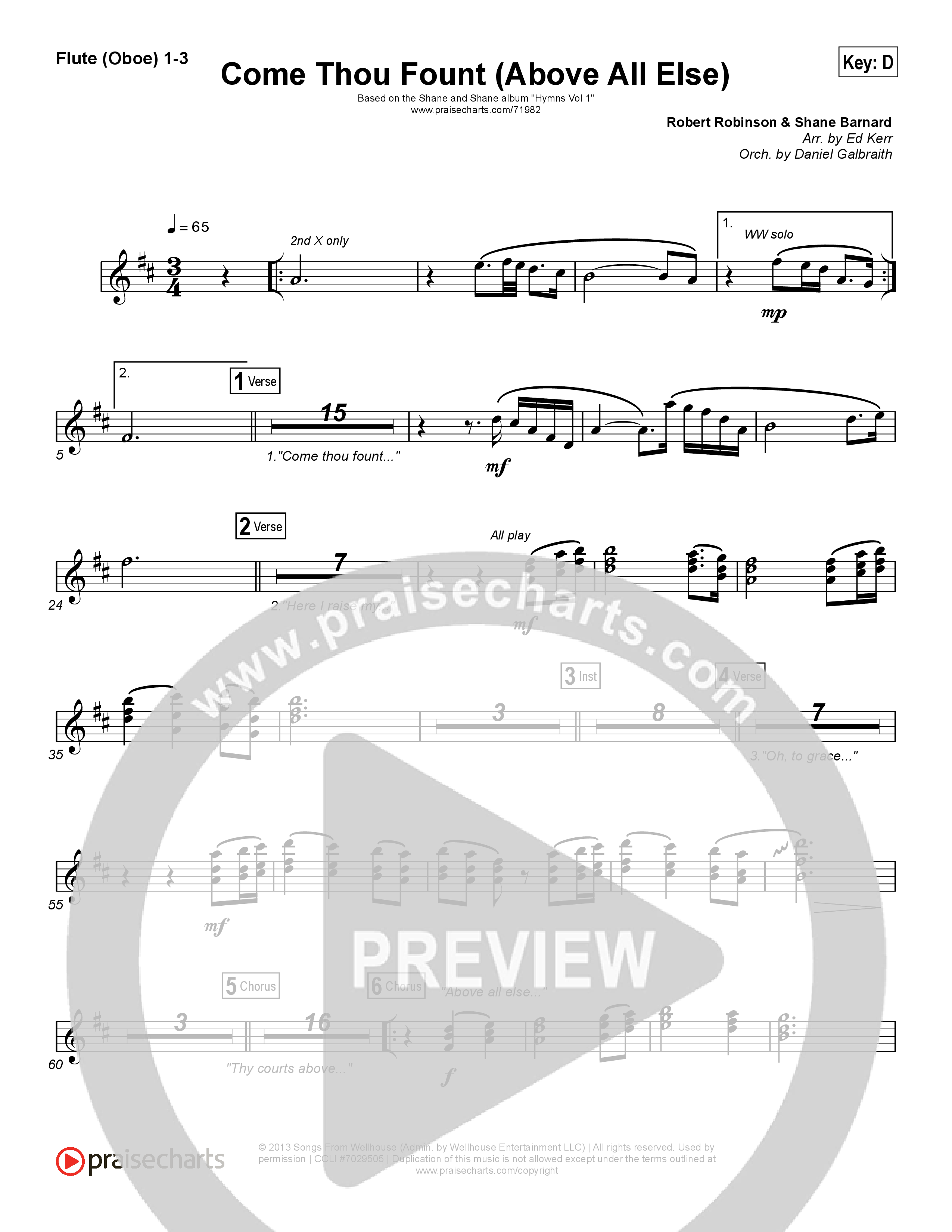 Download the Flute/Oboe sheet music for Come Thou Fount (Above All Else) by Shane & Shane / The Worship Initiative, from the album Hymns Vol 1. This song was arranged by Ed Kerr / Daniel Galbraith in the key of C, D.