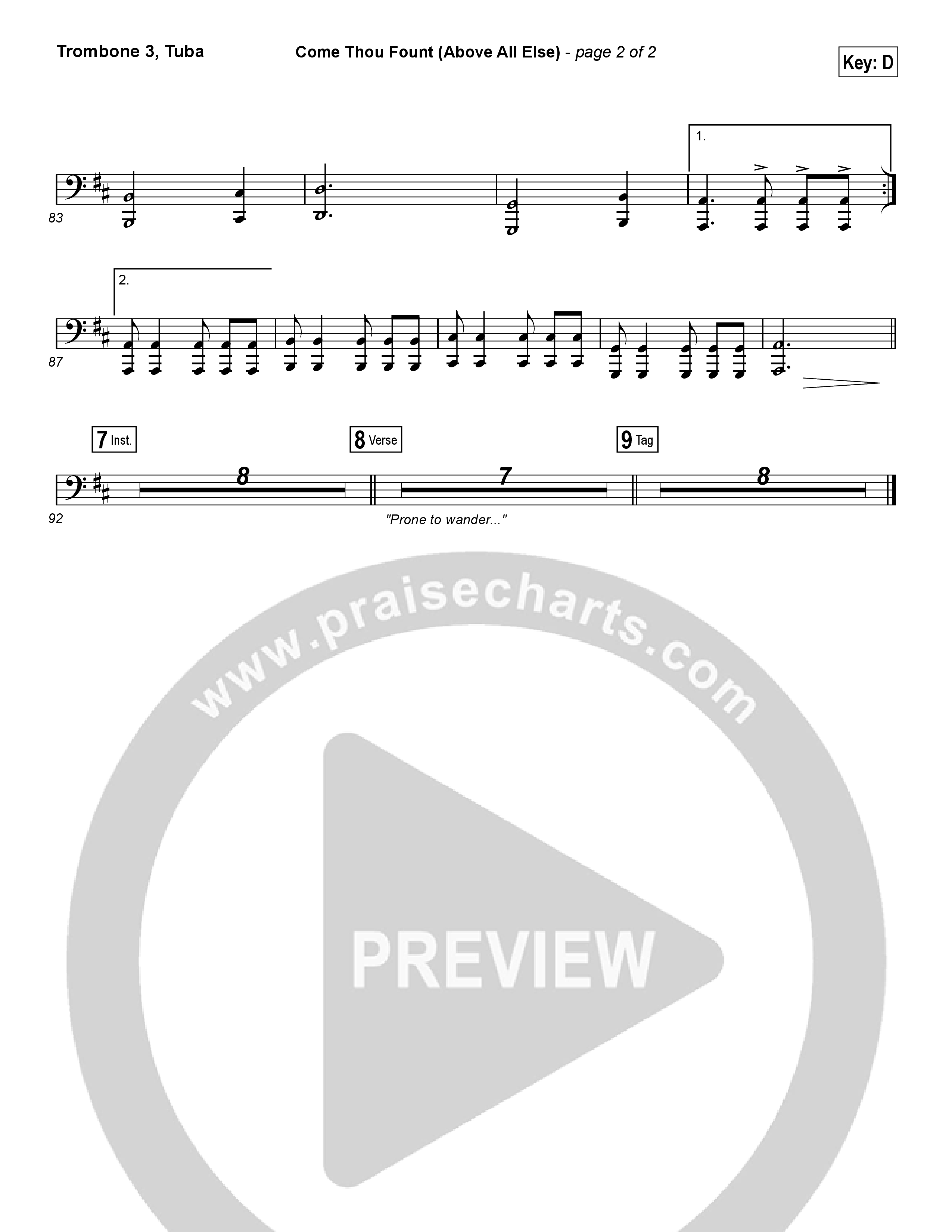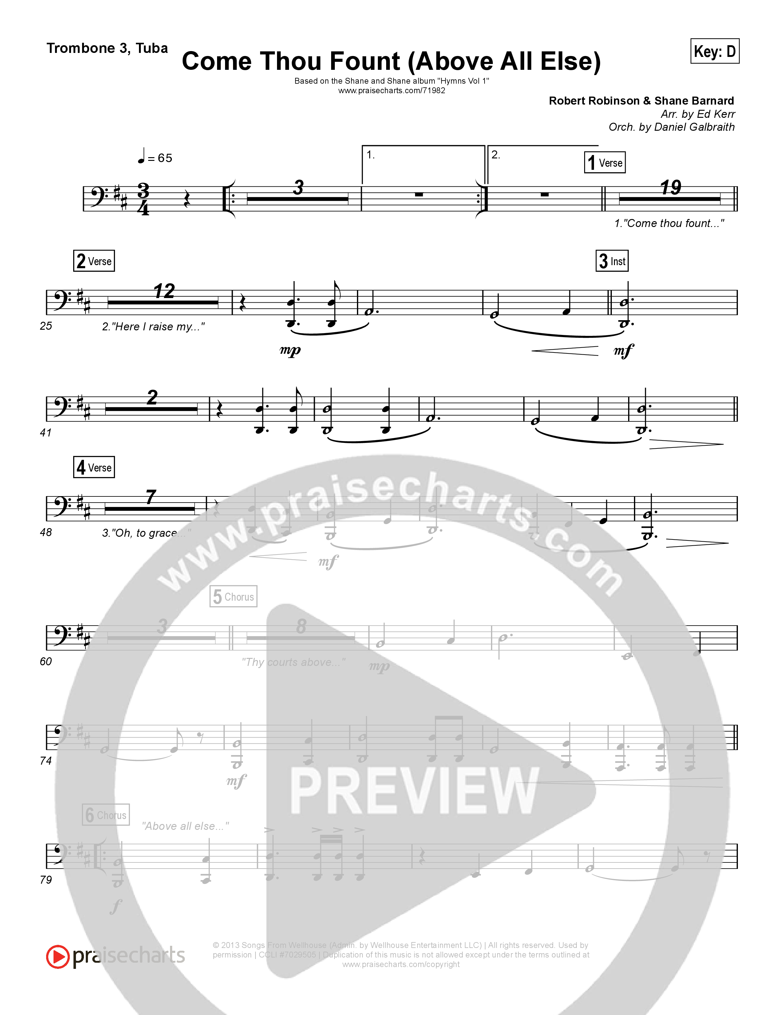 Download the Trombone 3/Tuba sheet music for Come Thou Fount (Above All Else) by Shane & Shane / The Worship Initiative, from the album Hymns Vol 1. This song was arranged by Ed Kerr / Daniel Galbraith in the key of C, D.