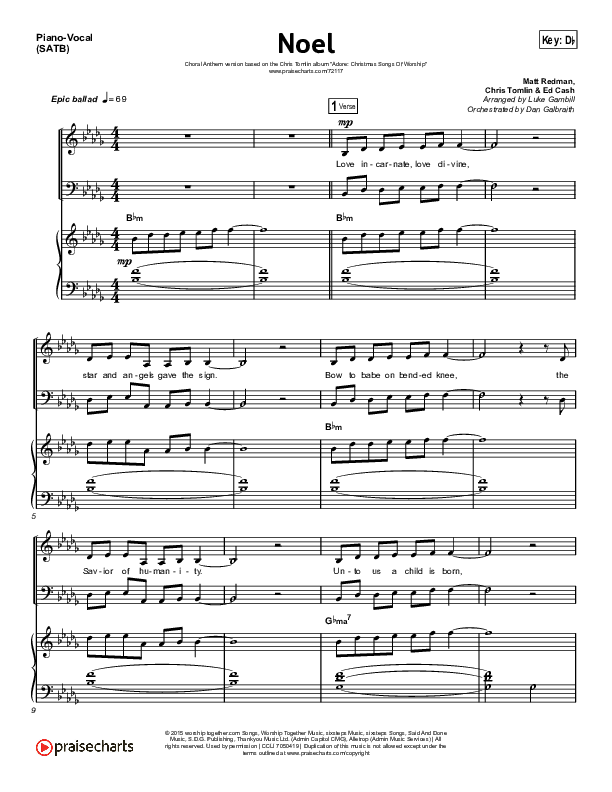 Download the sheet music for Noel (Choral Anthem SATB) by Lauren Daigle / Arr. Luke Gambill, from the album Adore: Christmas Songs Of Worship. This song was arranged by Luke Gambill / Daniel Galbraith in the key of Db.