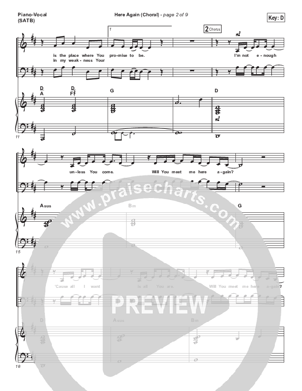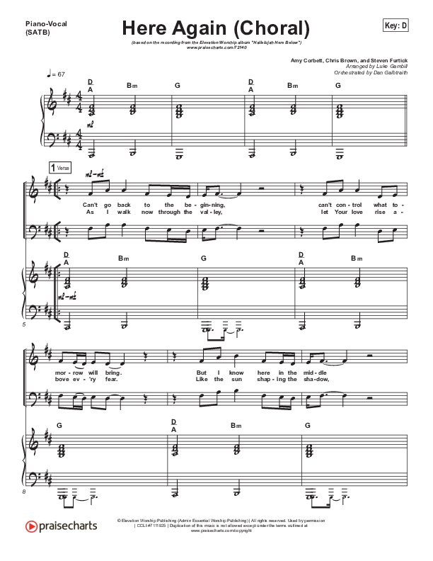 Download the sheet music for Here Again (Choral Anthem SATB) by Elevation Worship / Arr. Luke Gambill, from the album Hallelujah Here Below. This song was arranged by Luke Gambill / Daniel Galbraith in the key of D.