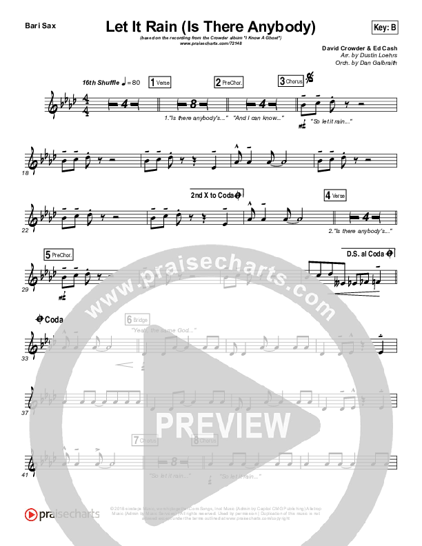 Download the Bari Sax sheet music for Let It Rain (Is There Anybody) by Mandisa / Crowder, from the album I Know A Ghost. This song was arranged by Dustin Loehrs / Daniel Galbraith in the key of B, Bb.