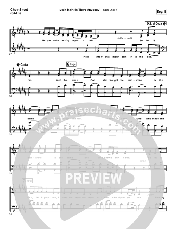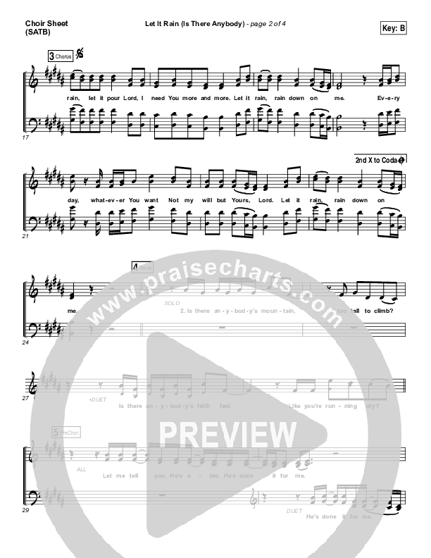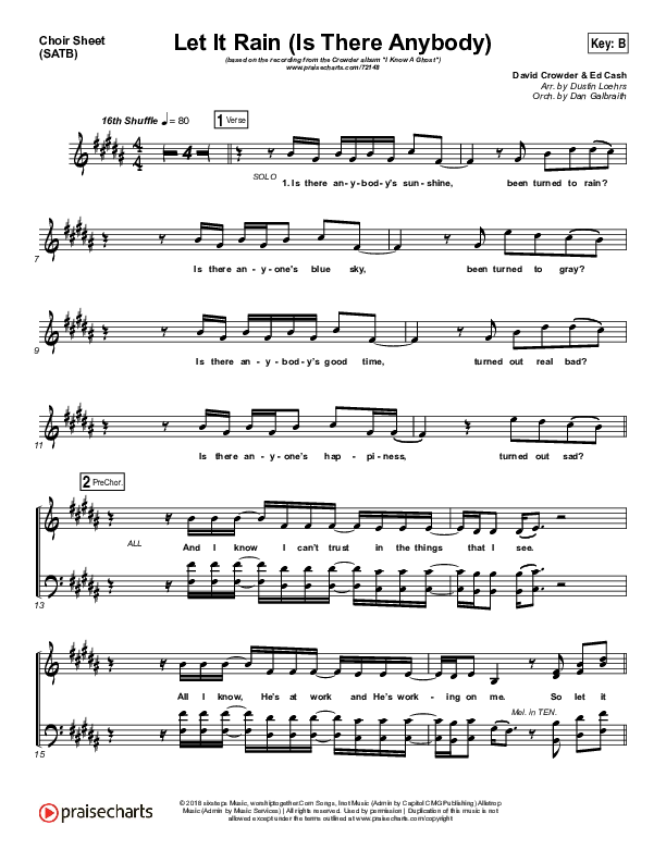 Download the Choir Sheet for Let It Rain (Is There Anybody) by Mandisa / Crowder, from the album I Know A Ghost. This song was arranged by Dustin Loehrs / Daniel Galbraith in the key of B, Bb.