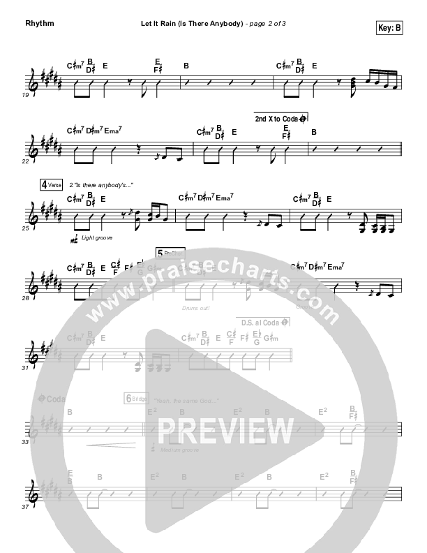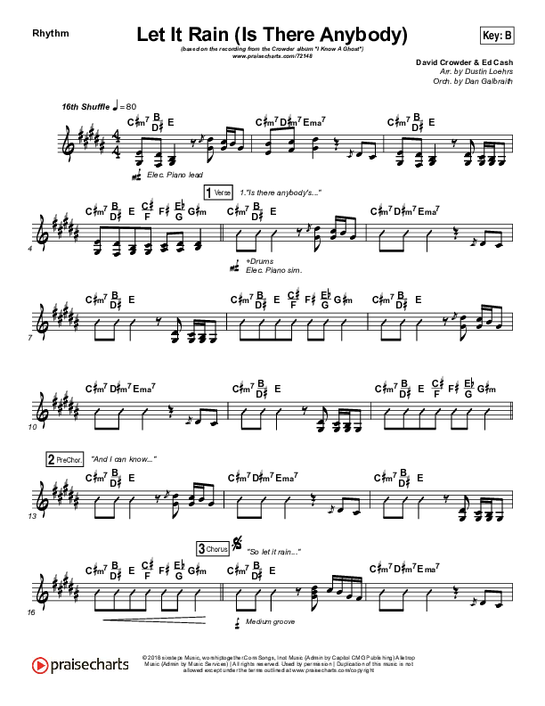 Download the Rhythm Chart for Let It Rain (Is There Anybody) by Mandisa / Crowder, from the album I Know A Ghost. This song was arranged by Dustin Loehrs / Daniel Galbraith in the key of B, Bb.