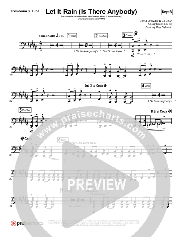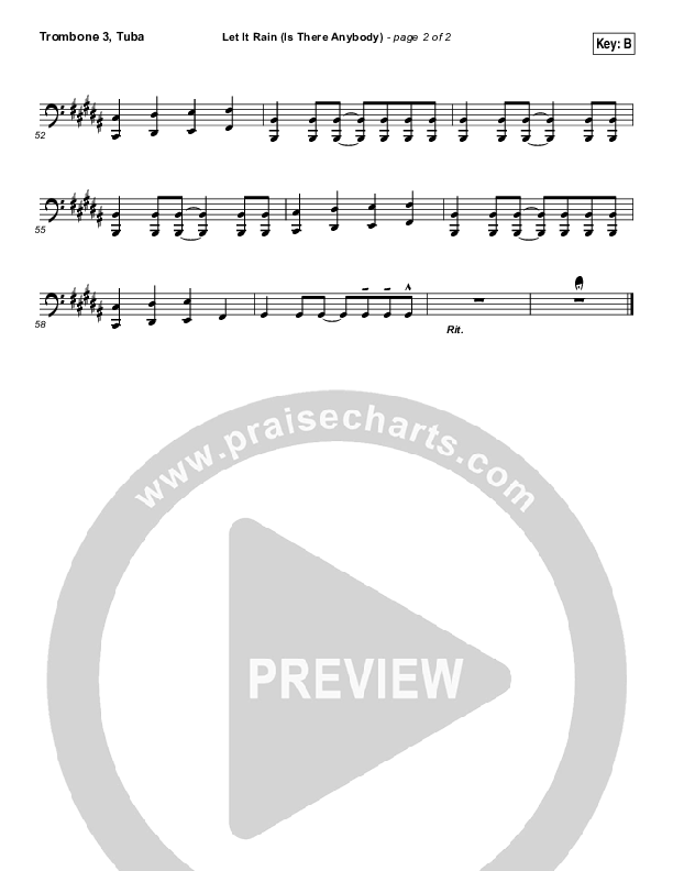 Download the Trombone 3/Tuba sheet music for Let It Rain (Is There Anybody) by Mandisa / Crowder, from the album I Know A Ghost. This song was arranged by Dustin Loehrs / Daniel Galbraith in the key of B, Bb.