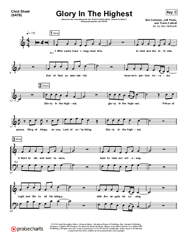Download the Choir Sheet for Glory In The Highest by Travis Cottrell / Lily Cottrell, from the album Heaven's Hope. This song was arranged by Daniel Galbraith in the key of Bb, C.