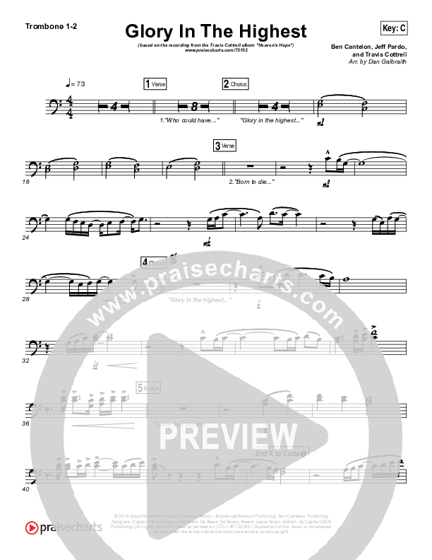 Download the Trombone 1,2 sheet music for Glory In The Highest by Travis Cottrell / Lily Cottrell, from the album Heaven's Hope. This song was arranged by Daniel Galbraith in the key of Bb, C.