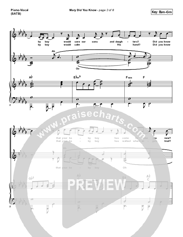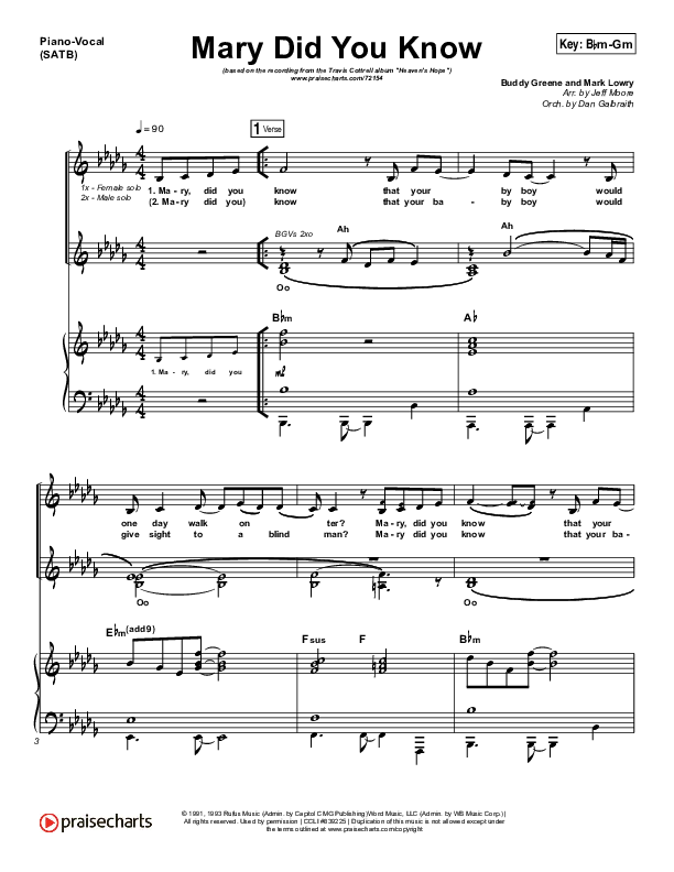 Download the sheet music for Mary Did You Know by Travis Cottrell, from the album Heaven's Hope. This song was arranged by Jeff Moore / Daniel Galbraith in the key of Am, Bbm.