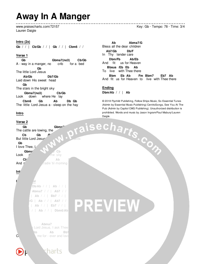 Download the PDF Chord Charts for Away In A Manger by Lauren Daigle, from the album Behold. This song was arranged by Grant Wall / Daniel Galbraith in the key of G, Gb.