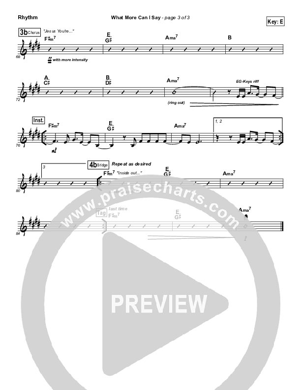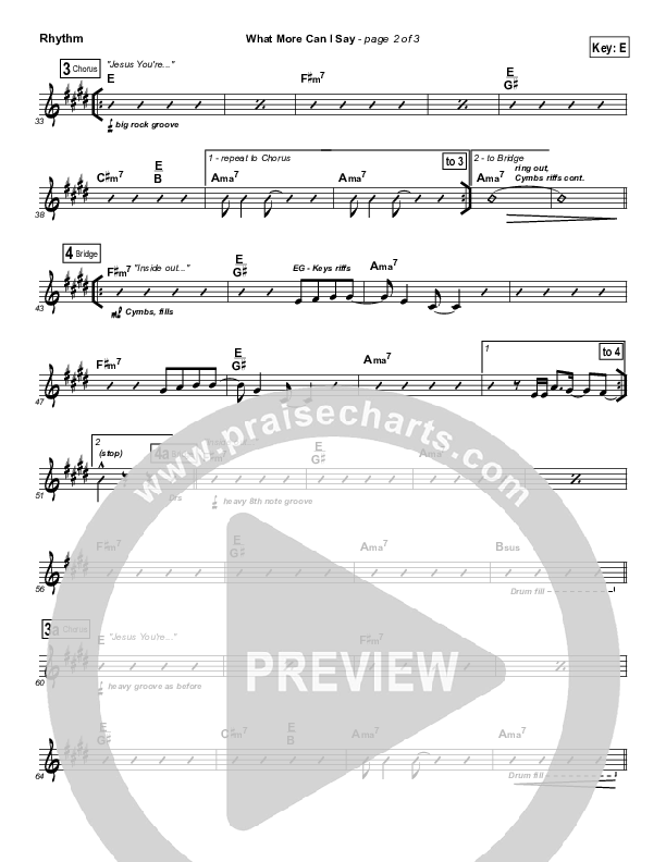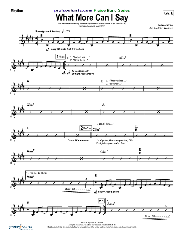 Download the Rhythm Chart for What More Can I Say by Equippers Church, from the album Can You Feel It. This song was arranged by John Wasson in the key of E, Eb.