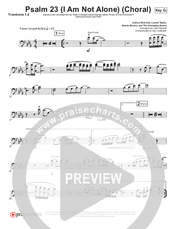 Download the Trombone 1,2 sheet music for Psalm 23 (I Am Not Alone) (Choral Anthem SATB) by People & Songs / Arr. Luke Gambill, from the album Psalm 23 (I Am Not Alone). This song was arranged by Luke Gambill / Daniel Galbraith in the key of Eb.
