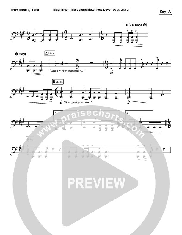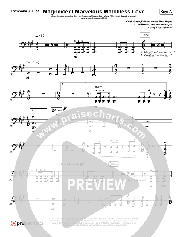 Download the Trombone 3/Tuba sheet music for Magnificent Marvelous Matchless Love by Keith & Kristyn Getty, from the album The North Coast Sessions. This song was arranged by Paul Campbell / Simon Nathan in the key of A, Bb.