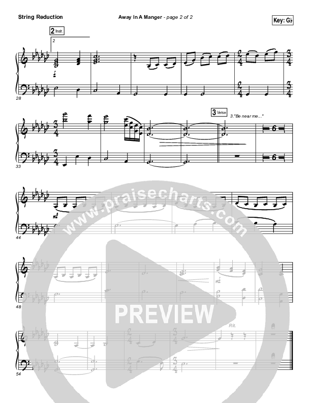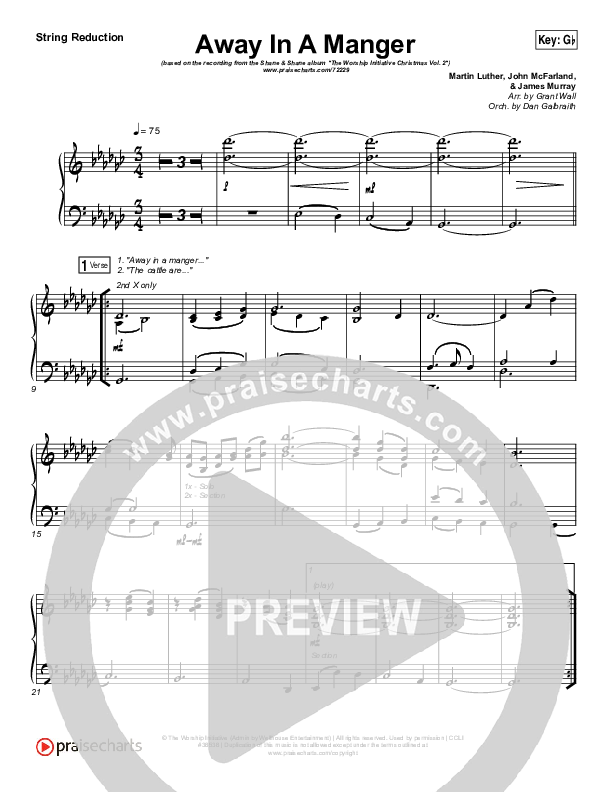 Download the Orchestration string parts for Away In A Manger by Shane & Shane / The Worship Initiative, from the album A Worship Initiative Christmas Volume 2. This song was arranged by Grant Wall / Daniel Galbraith in the key of G, Gb.