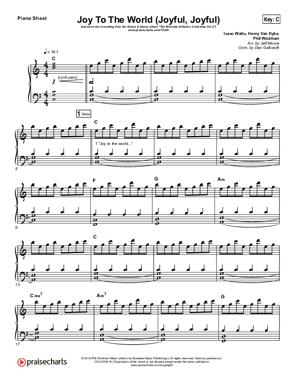 Download the piano sheet for Joy To The World (Joyful Joyful) by Shane & Shane / Phil Wickham / The Worship Initiative, from the album A Worship Initiative Christmas Volume 2. This song was arranged by Jeff Moore / Daniel Galbraith in the key of A, B, Bb, C.
