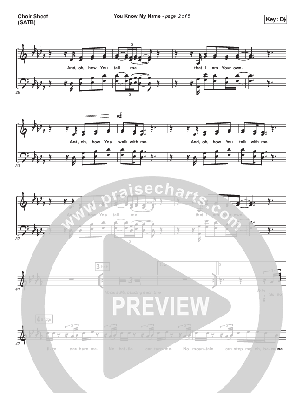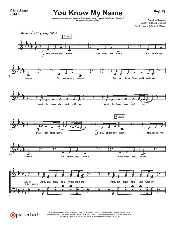 Download the Choir Sheet for You Know My Name by Tasha Cobbs Leonard, from the album Heart Passion Pursuit: Live At Passion City Church. This song was arranged by Dave Iula in the key of D, Db.