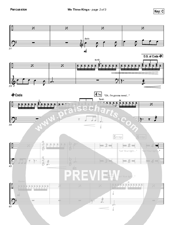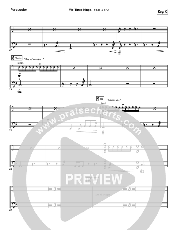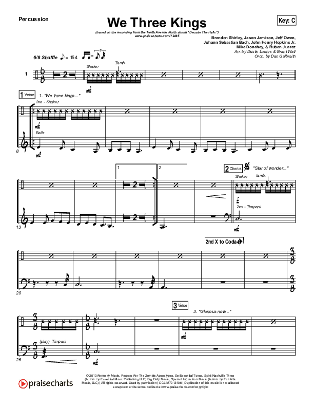 Download the percussion sheet music for We Three Kings by Tenth Avenue North / Britt Nicole, from the album Decade The Halls Vol 1. This song was arranged by Dustin Loehrs / Daniel Galbraith in the key of C, Db.