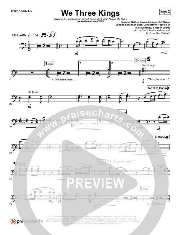 Download the Trombone 1,2 sheet music for We Three Kings by Tenth Avenue North / Britt Nicole, from the album Decade The Halls Vol 1. This song was arranged by Dustin Loehrs / Daniel Galbraith in the key of C, Db.
