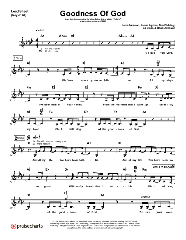 Download the sheet music for Goodness Of God by Bethel Music / Jenn Johnson, from the album Victory. This song was arranged by Ed Kerr in the key of A, Ab, Bb, C, G.