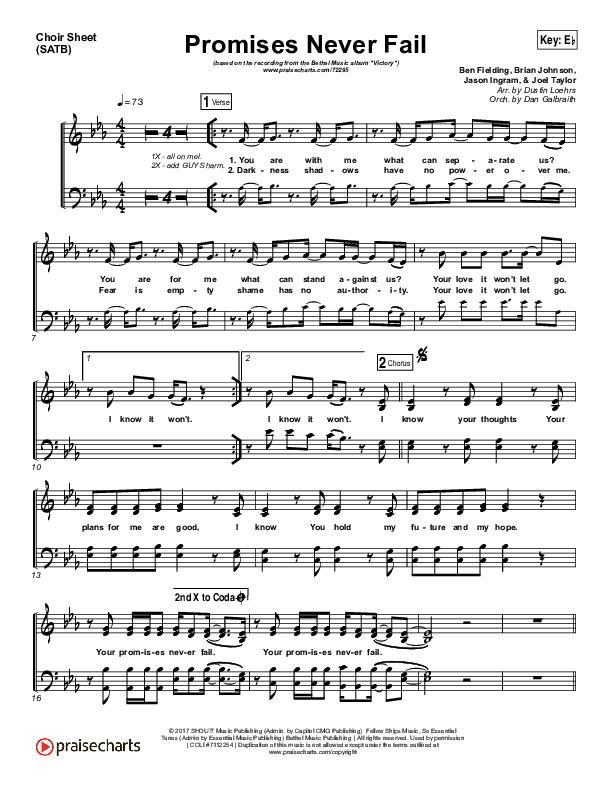 Download the Choir Sheet for Promises Never Fail by Bethel Music / Emmy Rose, from the album Victory. This song was arranged by Dustin Loehrs / Daniel Galbraith in the key of E, Eb.