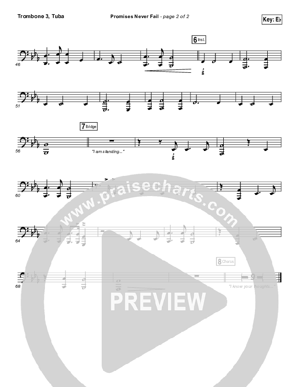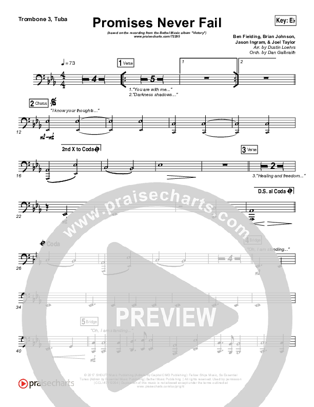Download the Trombone 3/Tuba sheet music for Promises Never Fail by Bethel Music / Emmy Rose, from the album Victory. This song was arranged by Dustin Loehrs / Daniel Galbraith in the key of E, Eb.