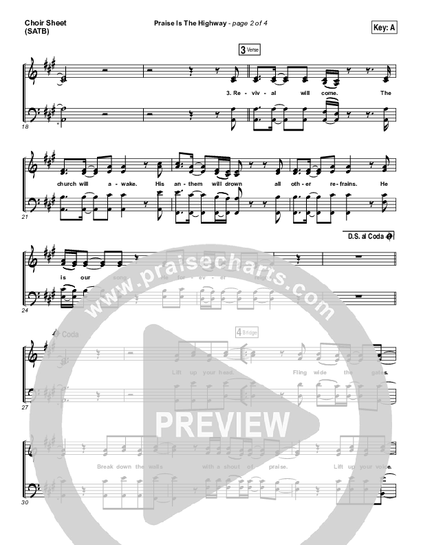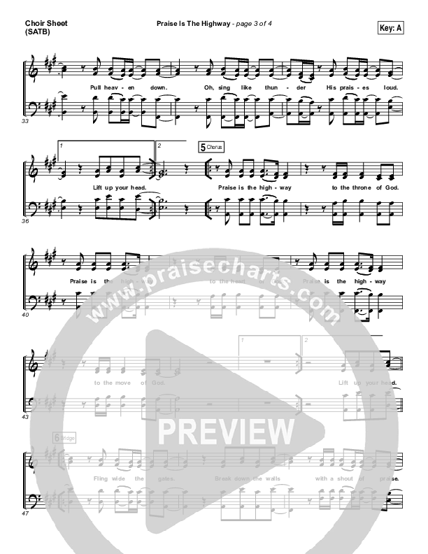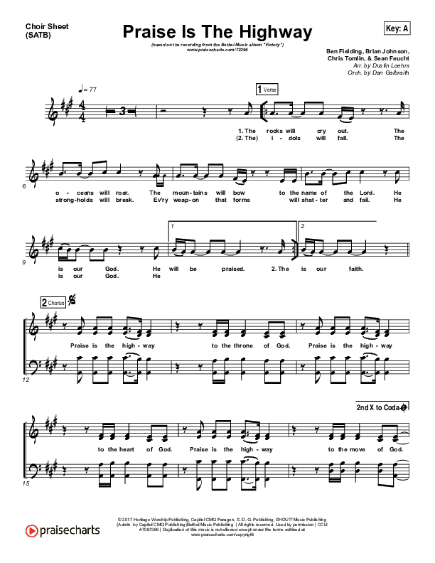 Download the Choir Sheet for Praise Is The Highway by Bethel Music / Brian Johnson, from the album Victory. This song was arranged by Dustin Loehrs / Daniel Galbraith in the key of A, G.