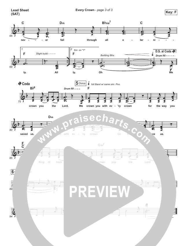 Download the sheet music for Every Crown by Bethel Music / kalley, from the album Victory. This song was arranged by Jeff Moore in the key of A, F.