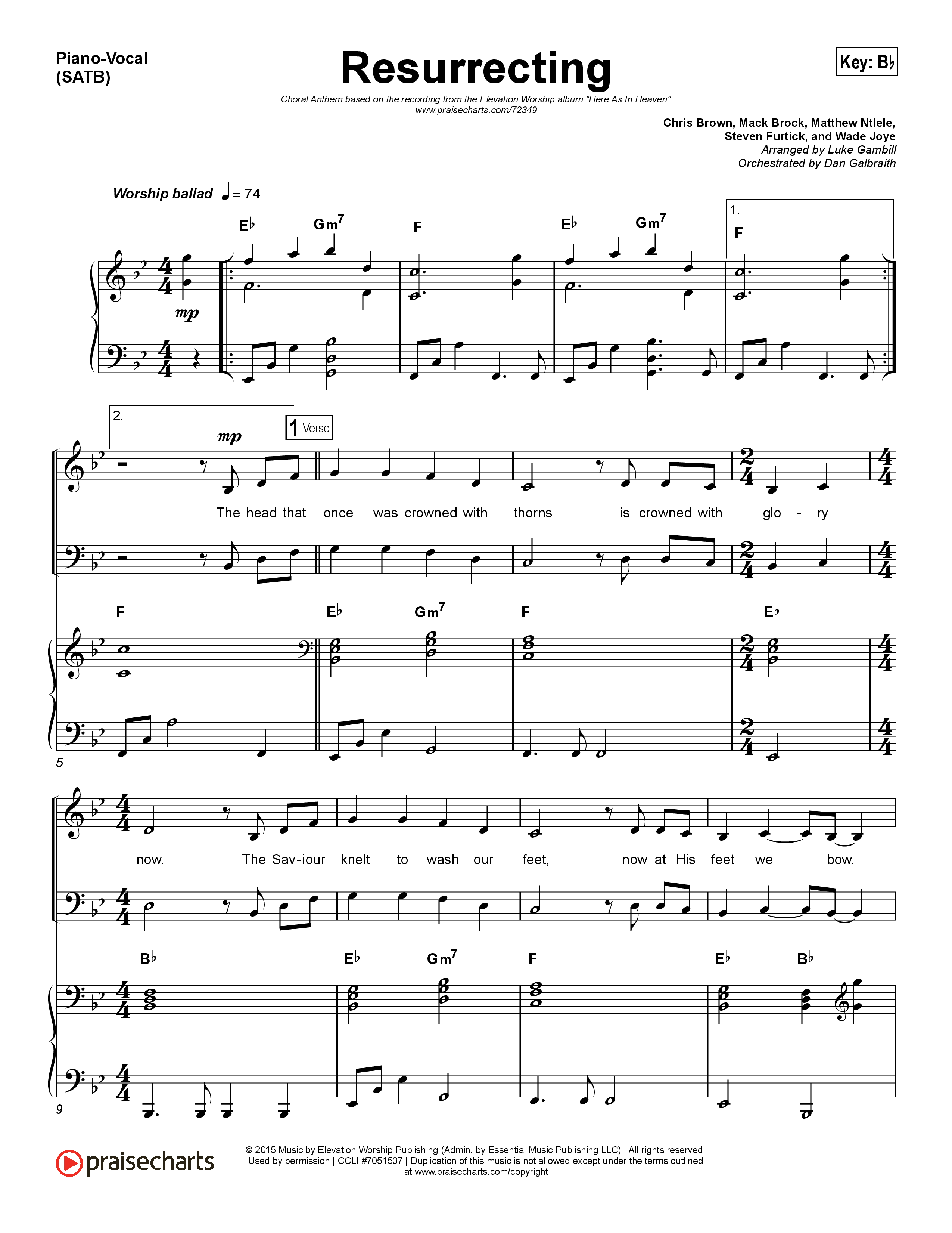 Download the sheet music for Resurrecting (Choral Anthem SATB) by Elevation Worship / Arr. Luke Gambill, from the album Here As In Heaven. This song was arranged by Luke Gambill / Daniel Galbraith in the key of Bb.