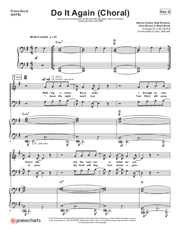 Download the sheet music for Do It Again (Choral Anthem SATB) by Elevation Worship / Arr. Luke Gambill, from the album There Is A Cloud. This song was arranged by Luke Gambill / Daniel Galbraith in the key of G.