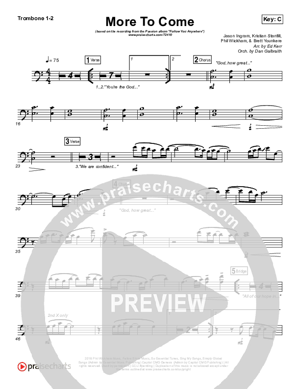 Download the Trombone 1,2 sheet music for More To Come by Passion / Kristian Stanfill, from the album Follow You Anywhere. This song was arranged by Ed Kerr / Daniel Galbraith in the key of Bb, C.