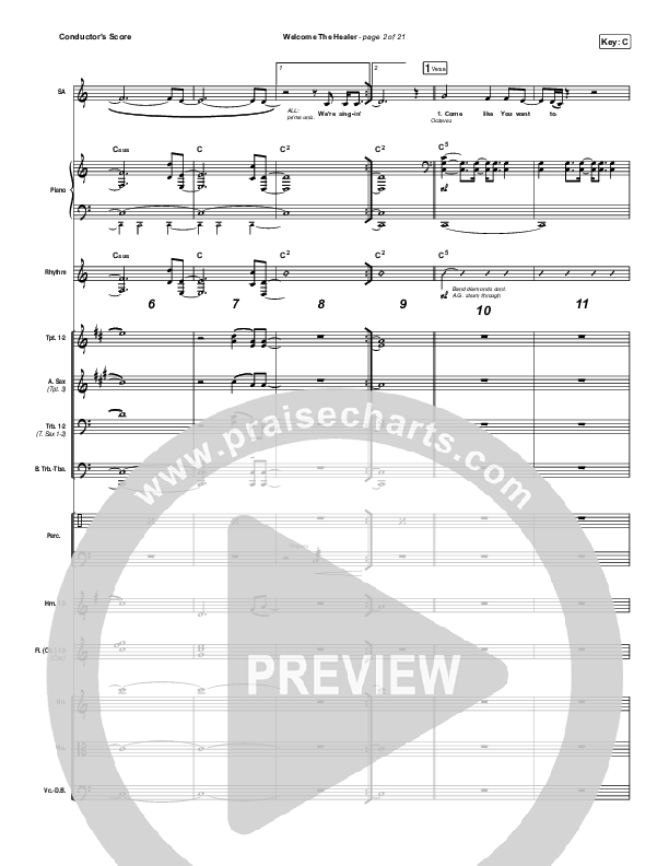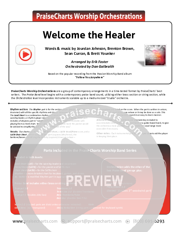 Download the Orchestration for Welcome The Healer by Passion / Sean Curran, from the album Follow You Anywhere. This song was arranged by Erik Foster / Daniel Galbraith in the key of Bb, C.
