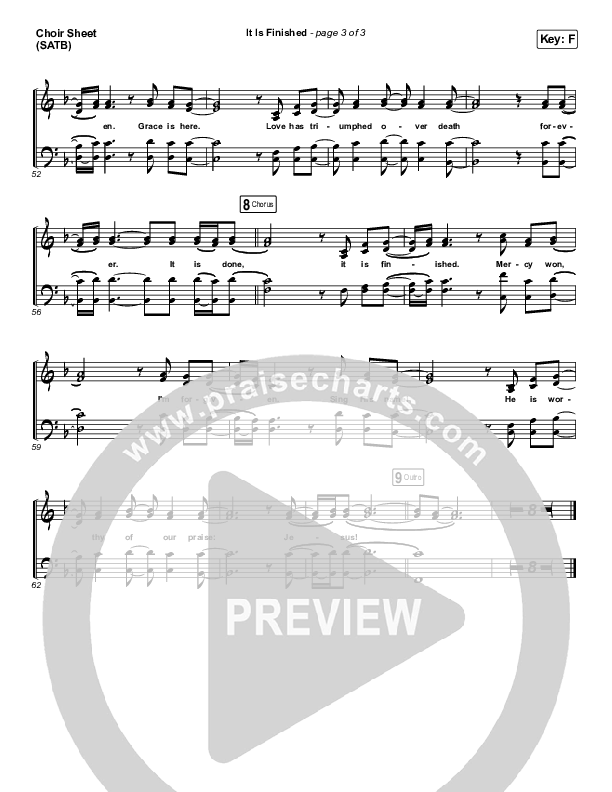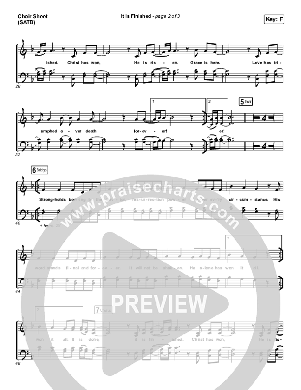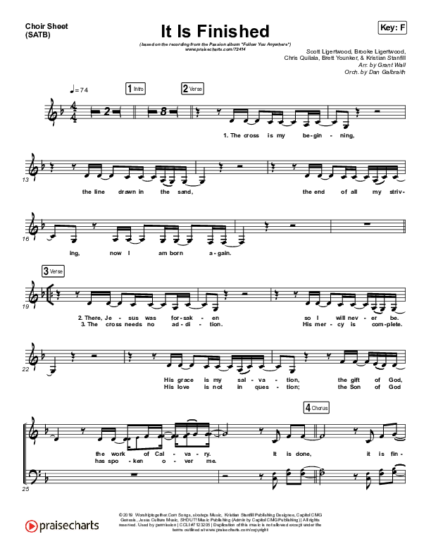 Download the Choir Sheet for It Is Finished by Passion / Melodie Malone, from the album Follow You Anywhere. This song was arranged by Grant Wall / Daniel Galbraith in the key of F, G.