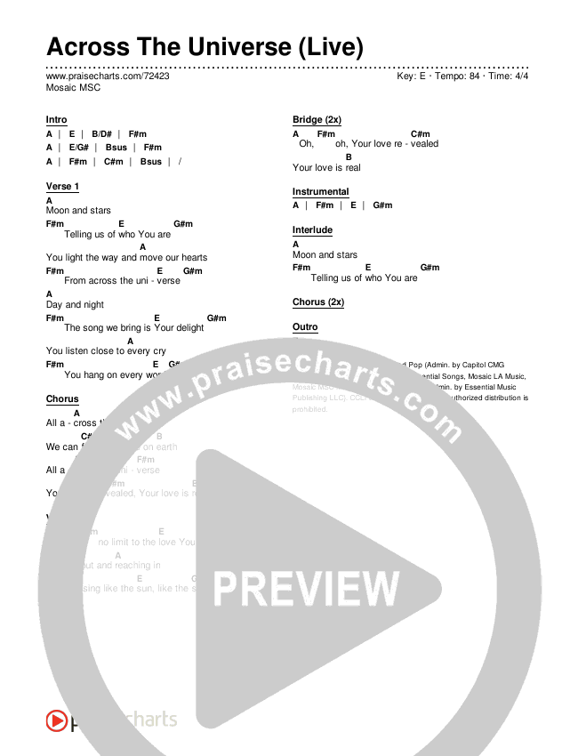 Download the PDF Chord Charts for Across The Universe (Live) by Mosaic MSC, from the album Across The Universe.