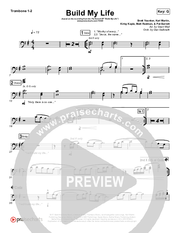 Download the Trombone 1,2 sheet music for Build My Life (Live) by Pat Barrett / Chris Tomlin, from the album Build My Life - EP. This song was arranged by Grant Wall / Daniel Galbraith in the key of F, G.