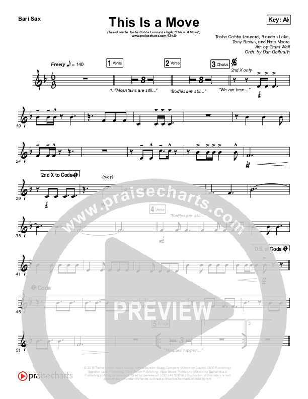 Download the Bari Sax sheet music for This Is A Move by Tasha Cobbs Leonard, from the album This Is A Move - Single. This song was arranged by Daniel Galbraith / Grant Wall in the key of Ab, G.