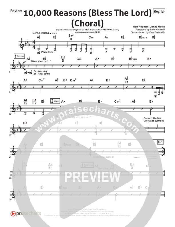 Download the Rhythm Chart for 10,000 Reasons (Bless The Lord) (Choral Anthem SATB) by Matt Redman / Passion / Arr. Luke Gambill, from the album 10000 Reasons. This song was arranged by Luke Gambill / Daniel Galbraith in the key of Eb.
