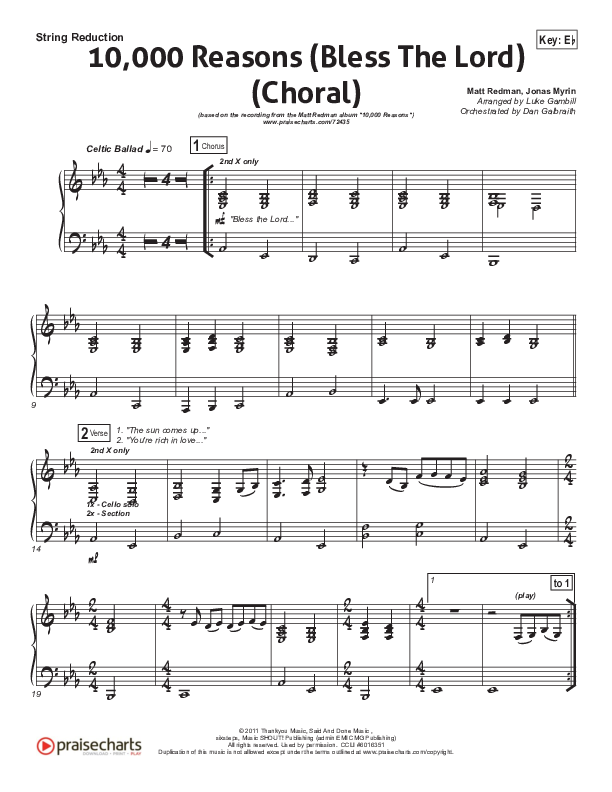 Download the Orchestration for 10,000 Reasons (Bless The Lord) (Choral Anthem SATB) by Matt Redman / Passion / Arr. Luke Gambill, from the album 10000 Reasons. This song was arranged by Luke Gambill / Daniel Galbraith in the key of Eb.
