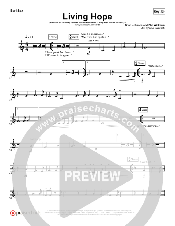 Download the Bari Sax sheet music for Living Hope by Phil Wickham, from the album Living Hope (House Sessions). This song was arranged by Daniel Galbraith in the key of D, Eb.