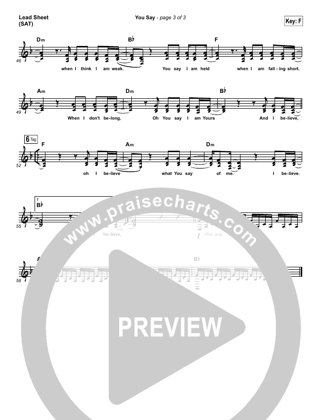 Download the sheet music for You Say (Piano) by Lauren Daigle, from the album Look Up Child. This song was arranged by Daniel Galbraith in the key of F.