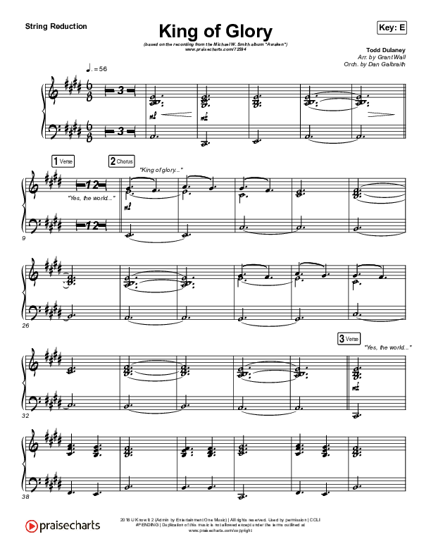 Download the Orchestration for King Of Glory by Michael W. Smith / CeCe Winans, from the album Awaken: The Surrounded Experience. This song was arranged by Daniel Galbraith in the key of E, Eb.