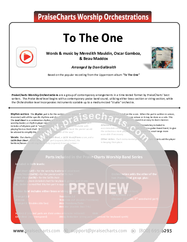 Download the Orchestration for To The One by UPPERROOM / Meredith Mauldin / Oscar Gamboa / Beau Maddox, from the album To The One. This song was arranged by Daniel Galbraith in the key of G, Gb.