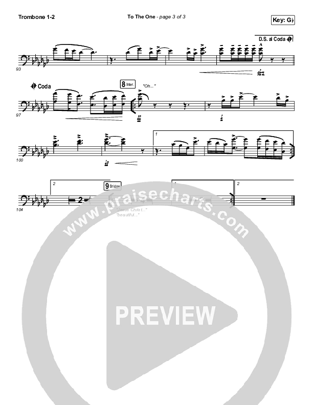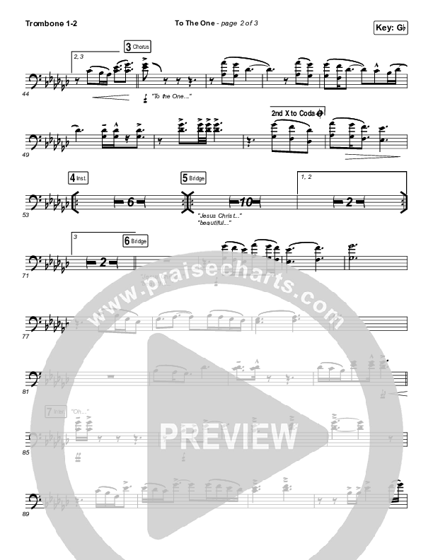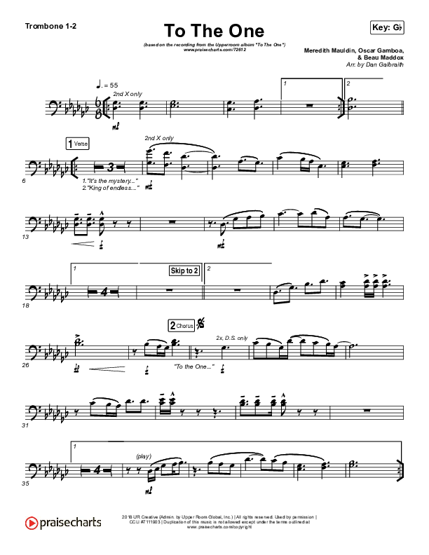 Download the Trombone 1,2 sheet music for To The One by UPPERROOM / Meredith Mauldin / Oscar Gamboa / Beau Maddox, from the album To The One. This song was arranged by Daniel Galbraith in the key of G, Gb.