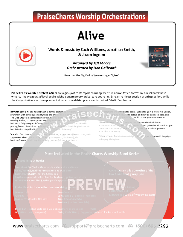 Download the Orchestration for Alive by Big Daddy Weave, from the album When The Light Comes. This song was arranged by Jeff Moore / Daniel Galbraith in the key of Bb, C.