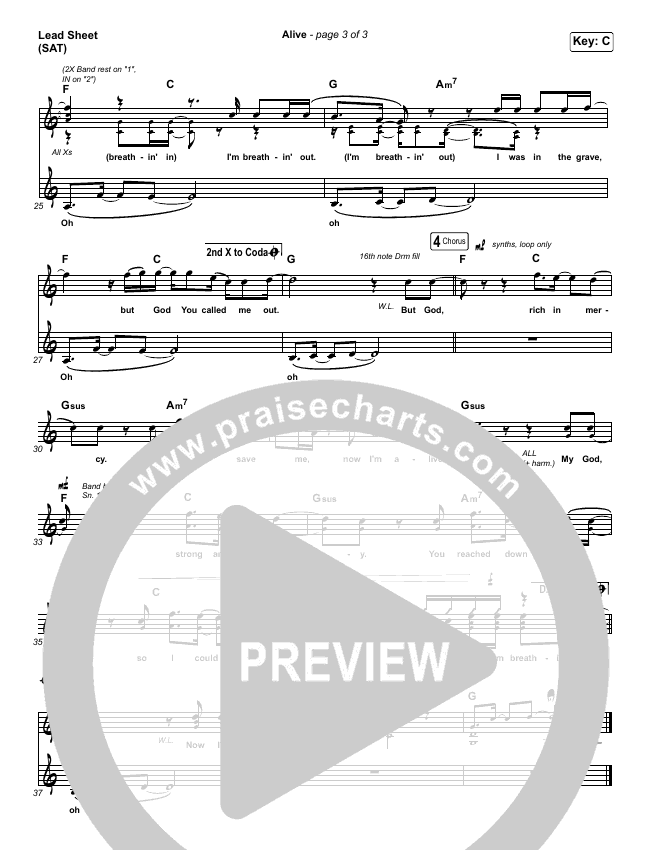 Download the sheet music for Alive by Big Daddy Weave, from the album When The Light Comes. This song was arranged by Jeff Moore / Daniel Galbraith in the key of Bb, C.