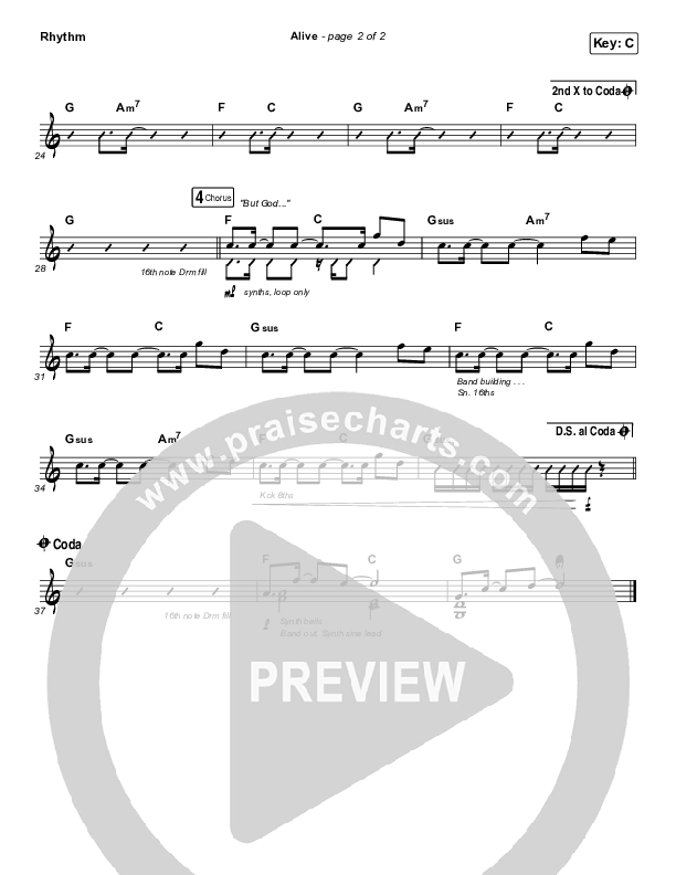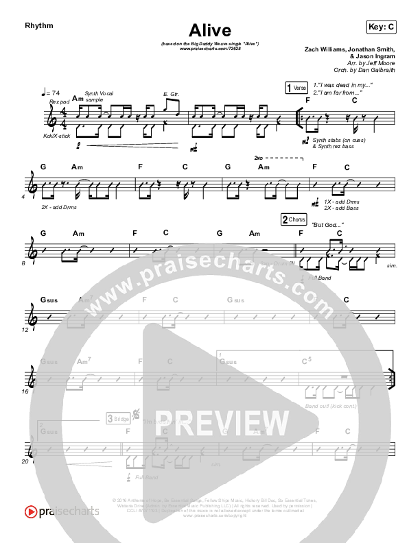 Download the Rhythm Chart for Alive by Big Daddy Weave, from the album When The Light Comes. This song was arranged by Jeff Moore / Daniel Galbraith in the key of Bb, C.