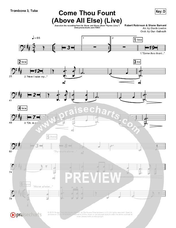 Download the Trombone 3/Tuba sheet music for Come Thou Fount (Above All Else) (Live) by Shane & Shane, from the album Hymns (Live). This song was arranged by Dustin Loehrs in the key of C, D.
