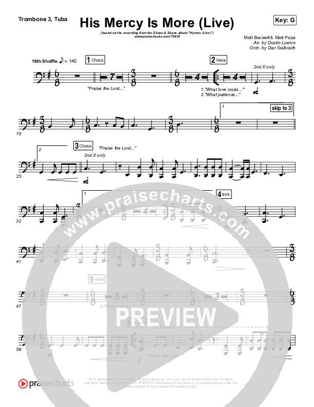 Download the Trombone 3/Tuba sheet music for His Mercy Is More (Live) by Shane & Shane, from the album Hymns (Live). This song was arranged by Daniel Galbraith / Dustin Loehrs in the key of F, G.
