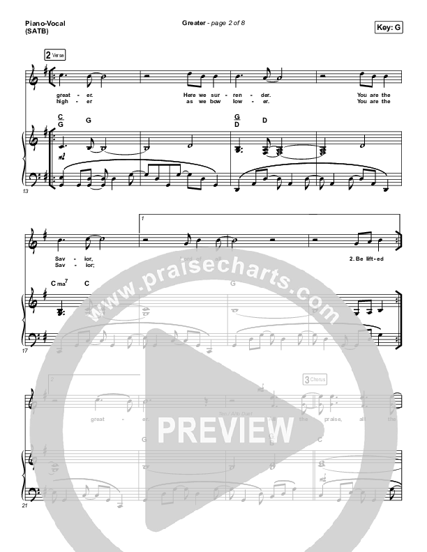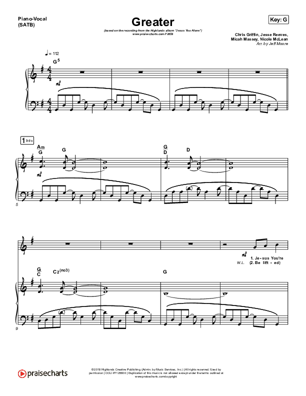 Download the sheet music for Greater by Highlands Worship, from the album Jesus You Alone. This song was arranged by Jeff Moore in the key of F, G.